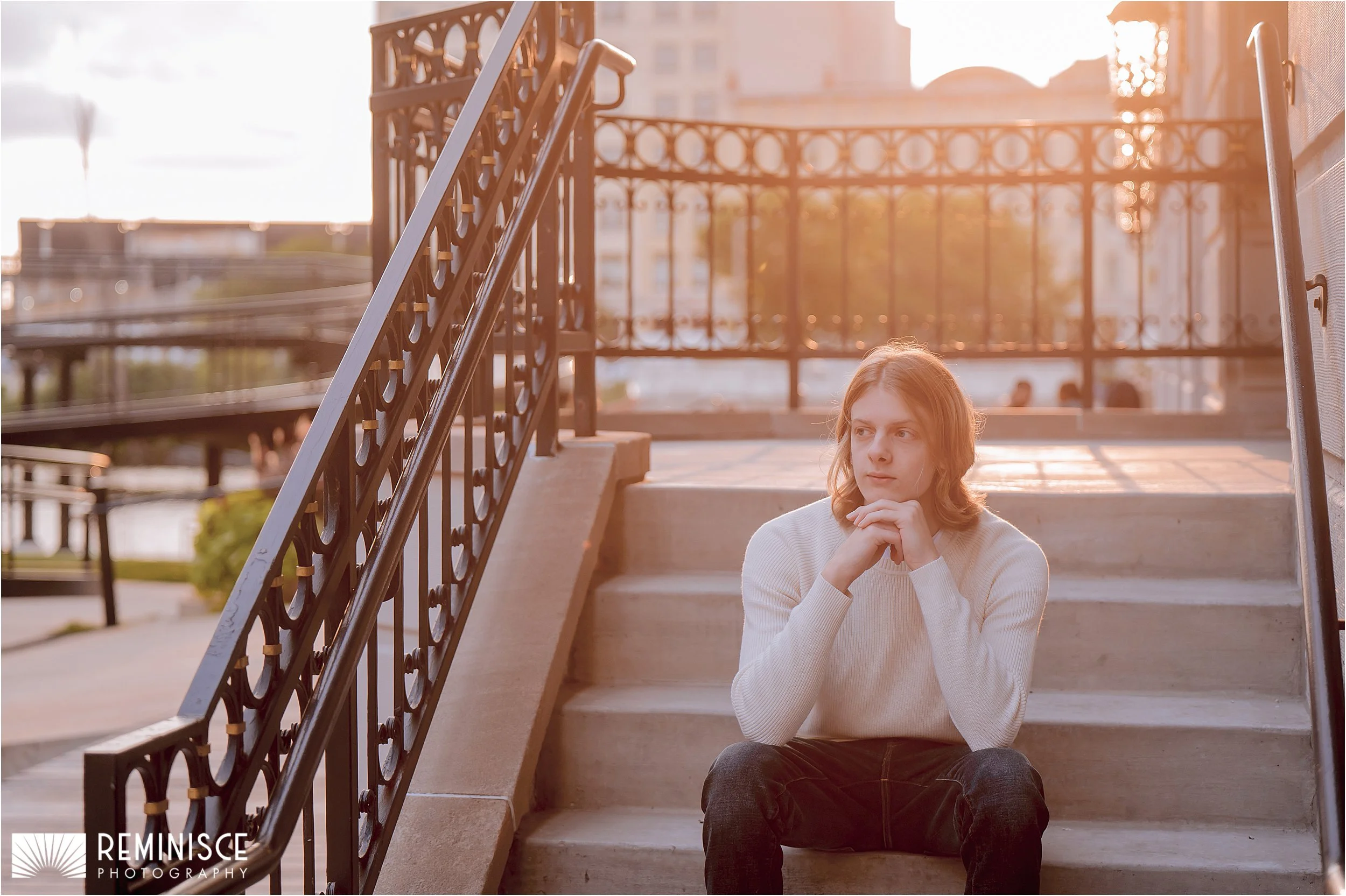 Golden hour in Milwaukee’s Third Ward gave Elias’ senior portraits the perfect vibe. The soft evening light brought out all the beautiful details of the Riverwalk and those historic buildings we love so much. Milwaukee’s cream city brick, mixed with the industrial elements of the area, made for such a cool, authentic backdrop. It’s no wonder the Third Ward is a go-to spot for so many Milwaukee, WI senior photographers!